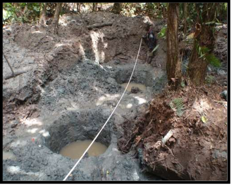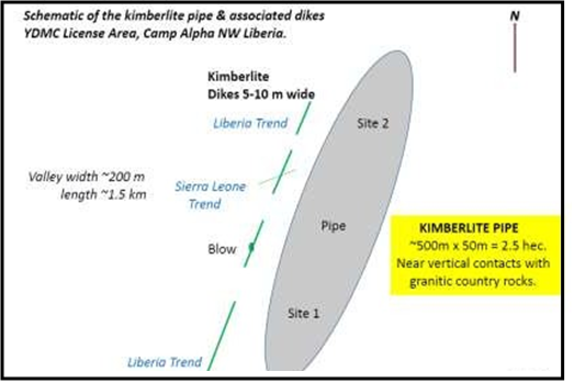 During the period of the original license (MEL 11035), YDMC discovered the Camp Alpha dikes and pipe. From trenching and pitting operations, the company found out that the dikes are near vertical, measuring about ~10 m in width, and ~ 1 km in length. The pipe was carefully delineated and found to be ~500 m in length, 40-50 m in width with an area of about 22,500 m2 [2.25 hectares]. The walls are vertical and contacts with the country rock are sharp; the overburden thickness of the humus layer is ~ 1m; the alluvial horizon is 1-1.5 m thick; and the solid kimberlite, like most known pipes in the world, may go down to the depth of over 200 km. The walls are vertical and the country rock contacts are sharp (Table 1).